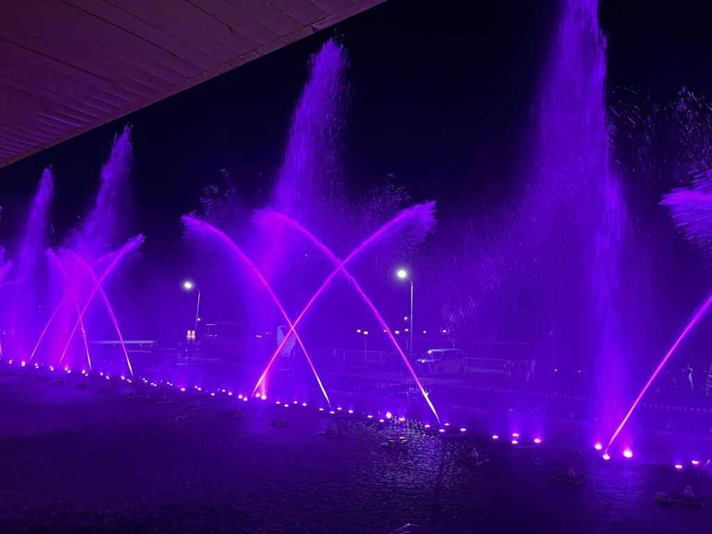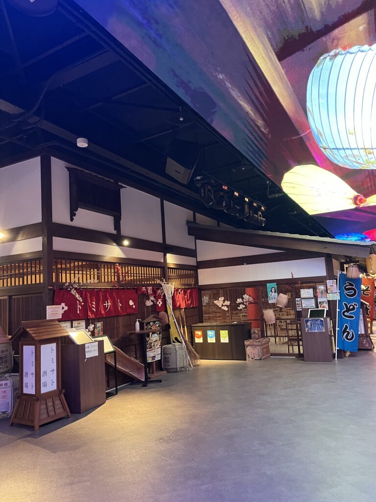 食事はパーク内にある、昭和の香り漂う飲食店街で。ここが雰囲気があってとってもいいんです。天井を彩るプロジェクションマッピングに目を奪われますよ。週末には中央にあるステージで演奏が行われているそう。光の噴水ショーは想像以上に激しいので盛り上がること請け合いです。近づき過ぎるとびしょ濡れになるほど豪快。噴水ショーは温泉施設にチェックイン前でも後でも見られますよ。